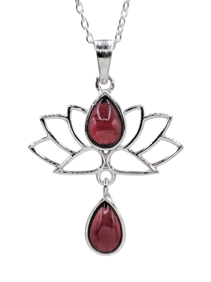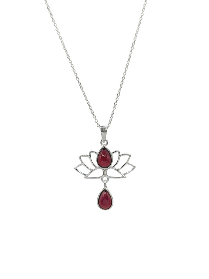 Como una flor que se abre al mundo, así nace este collar de plata de ley, con su delicado diseño de loto y dos lágrimas de granate que lo llenan de pasión serena, vitalidad y fuerza interior.