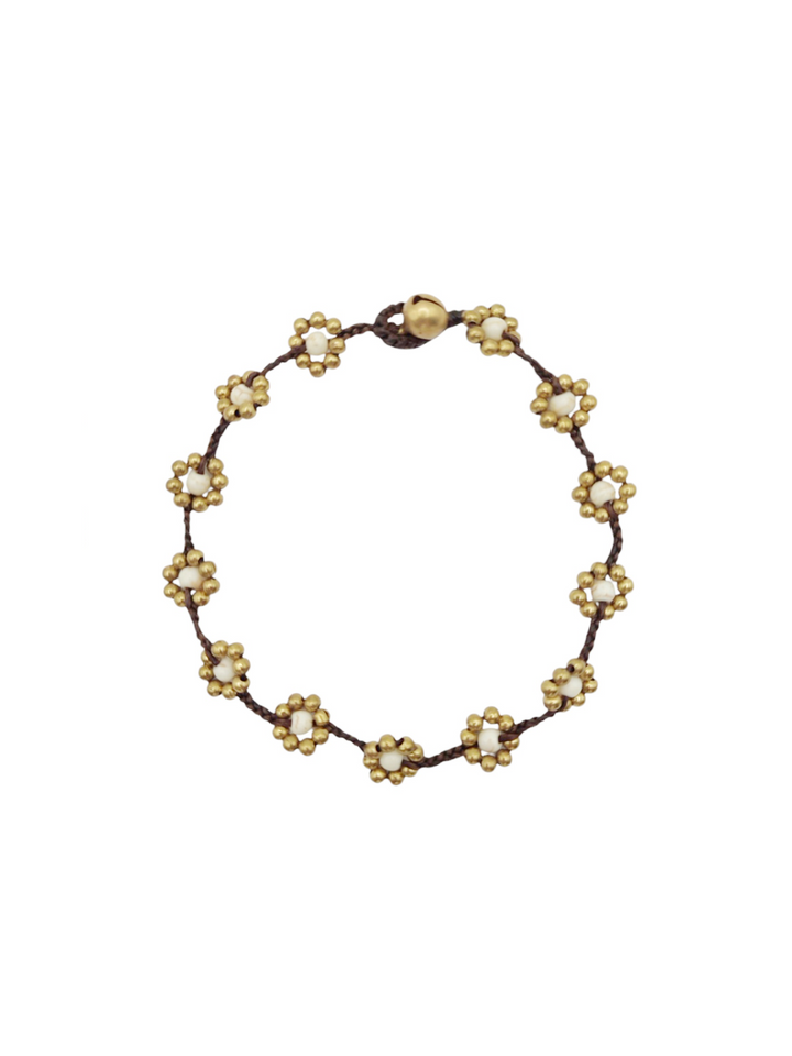 Pequeñas flores tejidas a mano con cuentas de latón y un corazón de howlita blanca, una piedra conocida por su energía suave, capaz de aquietar la mente y aliviar el alma.