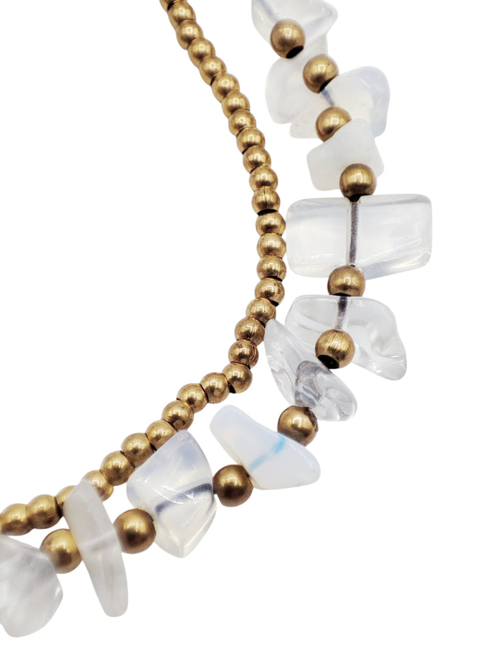 Una pieza delicada y luminosa hecha en macramé, con detalles en latón dorado y piedritas de opalita, que parecen recoger destellos de luna en cada giro.