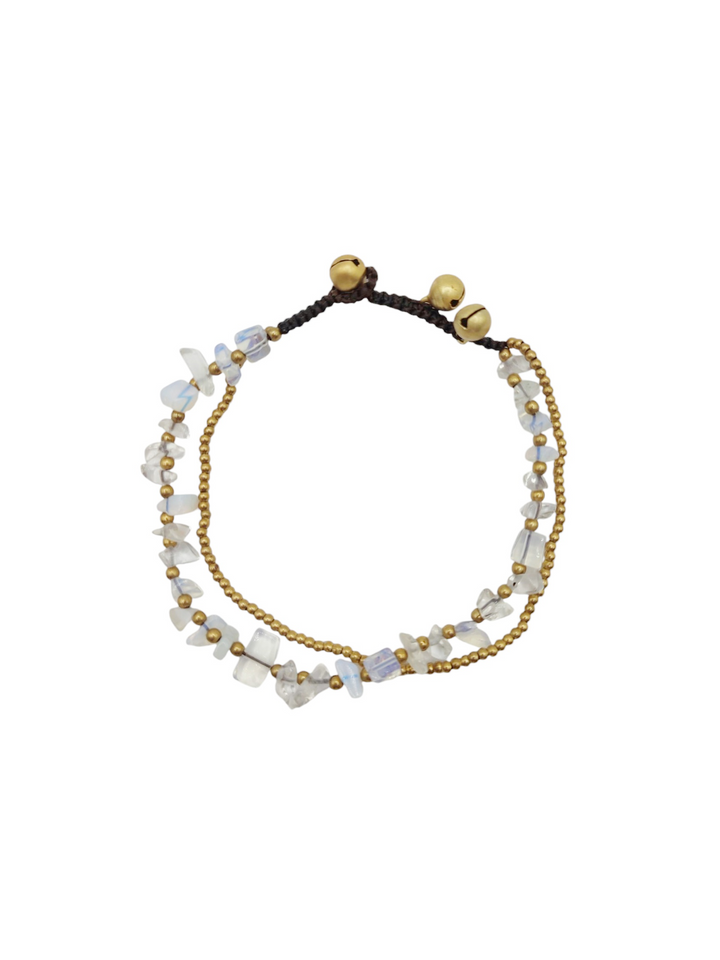 Sus dos cadenas finitas, una con cuentas doradas y otra salpicada de piedras, crean un juego de texturas que abraza con suavidad tu tobillo.